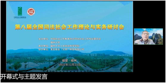 和社会工作教育协会司法社会工作分会共同申办这次年会,本次会议为各地的学者和实务工作者提供广阔的交流研讨平台,期盼本次大会以习近平新时代中国特色社会主义思想为指导坚持理论的联系实际围绕司法社会工作领域有关的社会治理现代化展开交流讨论,为开启全面建设社会主义现代化国家新征程,实现中华民族伟大复兴中国梦,贡献智慧力量。最后,林胜教授预祝本次大会圆满成功,并祝愿大家多保重身体、工作顺利、万事顺意。