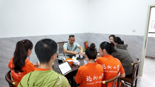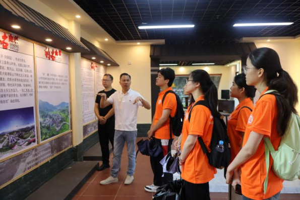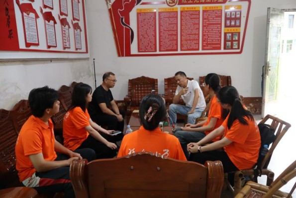 在里兴村乡源馆,实践队员首先听取了两位书记对村情概况的介绍。里兴村是革命基点村,地处抚市镇西南部,地形狭长,人才辈出,文化程度普遍较高,拥有丰厚的历史文化底蕴。基于此特色,里兴村着力打造“书呆子”文化IP,已设计完成卡通形象,并计划开发相关文创产品,但目前面临后备干部与运营人员短缺的挑战。