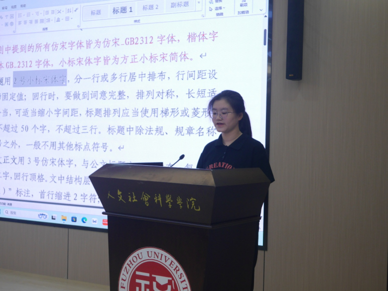 学生会主席团成员严婉蓉就基础办公技能的技巧与实操开展培训。她详细介绍了公文写作与表格制作的格式规范,重点讲解了文档排版、字体字号、标题结构、附件处理等内容,帮助各部门成员快速了解和掌握学院基础公文写作的要求与规范,夯实基础,有效提升工作质量与效率。