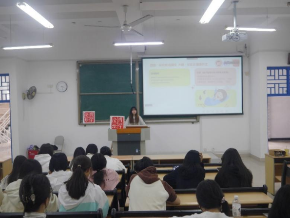 2024级汉语言文学专业的洪诗妍同学围绕题型介绍与备考策略展开,系统讲解了四六级考试的做题顺序、时间分配与注意事项,特别强调了听力部分需边听边涂卡的细节。她按照题型分类,依次介绍了听力、选词填空、匹配阅读、单项选择、翻译与写作的应试技巧,并提醒考生带好考试用品、调整好心态,做到有备无患。