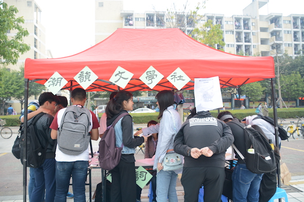 朝韵文学社在一区青春广场拉开阵势,开展诗词闯关大赛。围起的桌子和竖着的白板,像是文化的入口,呼唤着路过的学子们。