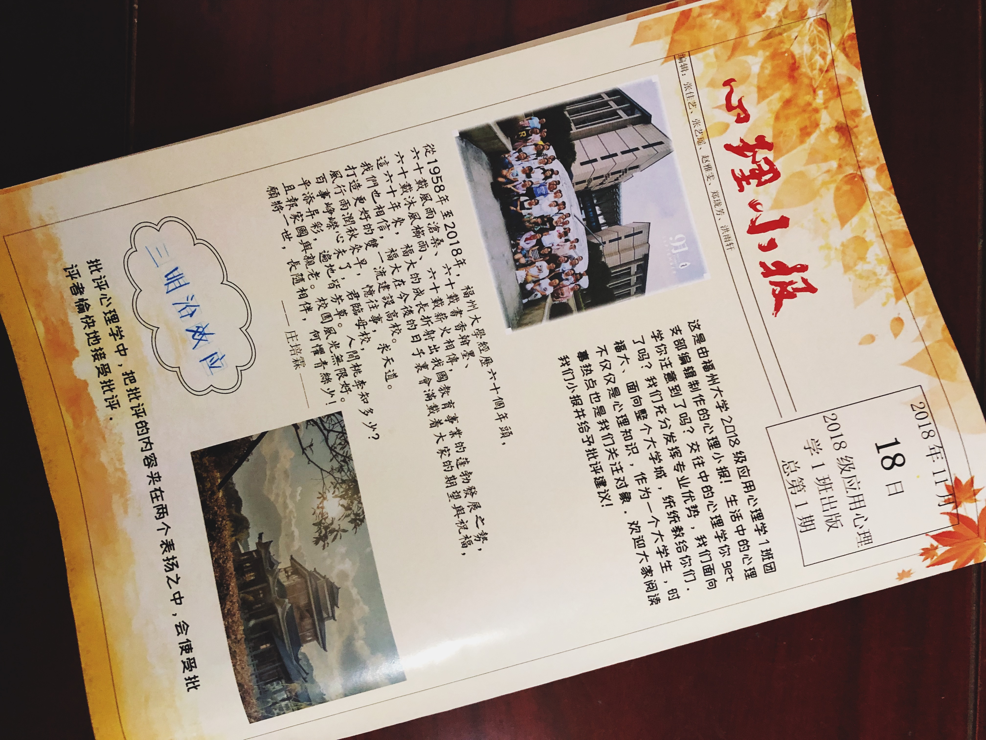 明亮轻快的版面设计,丰富有趣的小报内容,每一篇文章,每一个图案都包含着生活中的心理学。也许心理小报不像其他报纸一样专业,也许心理小报影响力不够大,但这份报纸注入了同学们的感情。历时3个月,从收集资料写稿子,到排版布局成报纸,从懵懵懂懂,到逐渐熟练,同学们的每一天都在成长!