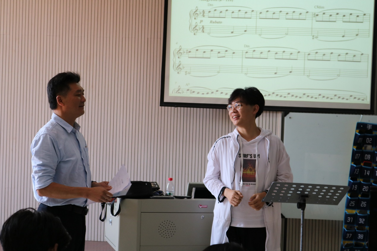 讲座进行中,优美的琴声与歌声融为一体,乐声一停,王群书记便对三位助唱同学进行了一系列与音乐审美相关的哲学提问,诸如“个体该如何恰到好处地理解这首作品?用何种心情诠释这首乐曲是合适的?演唱时脑海中最先构建的画面是什么?”积极有效的互动环节既舒缓了同学们原本紧张的情绪,也激发了年轻学子们的探求精神。随后,王群书记就歌词部分展开了细致的分析,并向同学们强调了艺术想象力的重要性。
