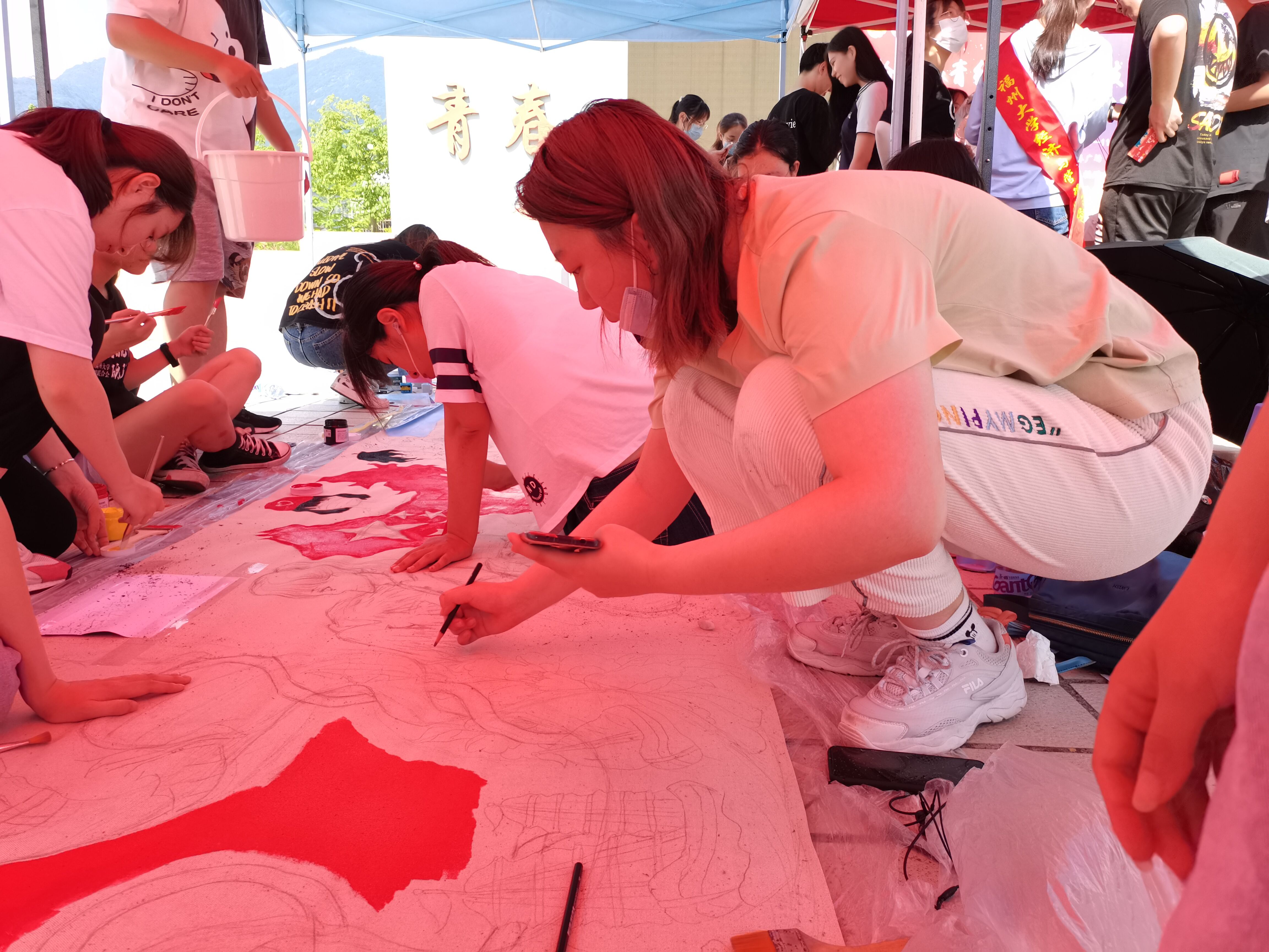 随后人文代表团在无帐篷的情况下顶着太阳暴晒作画,热辣的天气能让同学们大汗淋漓、汗流浃背,却不能阻挡他们参与的热情。打线稿、涂颜料、勾线条,熟悉的作画流程却又彰显着与平常不一样的风采。黄色、红色、蓝色越来越多的色彩融合在一起,经过同学们一个多小时的努力,板块上的图案也愈发清晰——草莓视频
