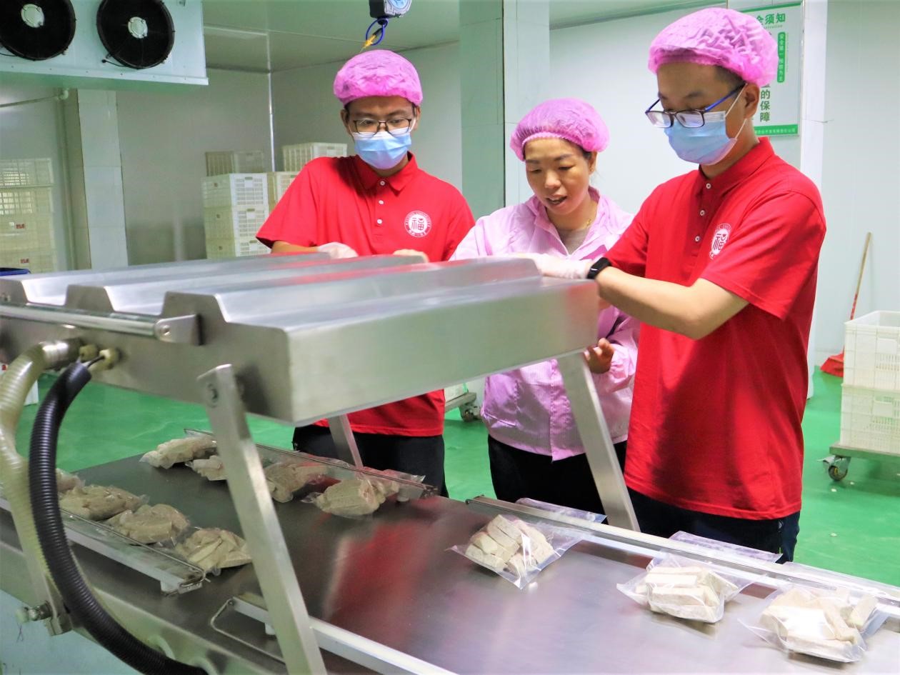 除了访谈,实践队还来到 “芋头王子”企业加工厂,在工厂负责人的带领下了解并参与到槟榔芋生产流水线加工的全过程。通过与流水线工人的访谈中了解到,“芋头王子”企业为当地村民提供了大量就近岗位,带动当地农民增收,不断巩固脱贫攻坚成果,对赤锡乡产业振兴起到了领头羊的作用。“芋头王子”一方面收获了创业的经济效益,另一方面积极承担社会责任,取得了助力乡村振兴的巨大社会效益。