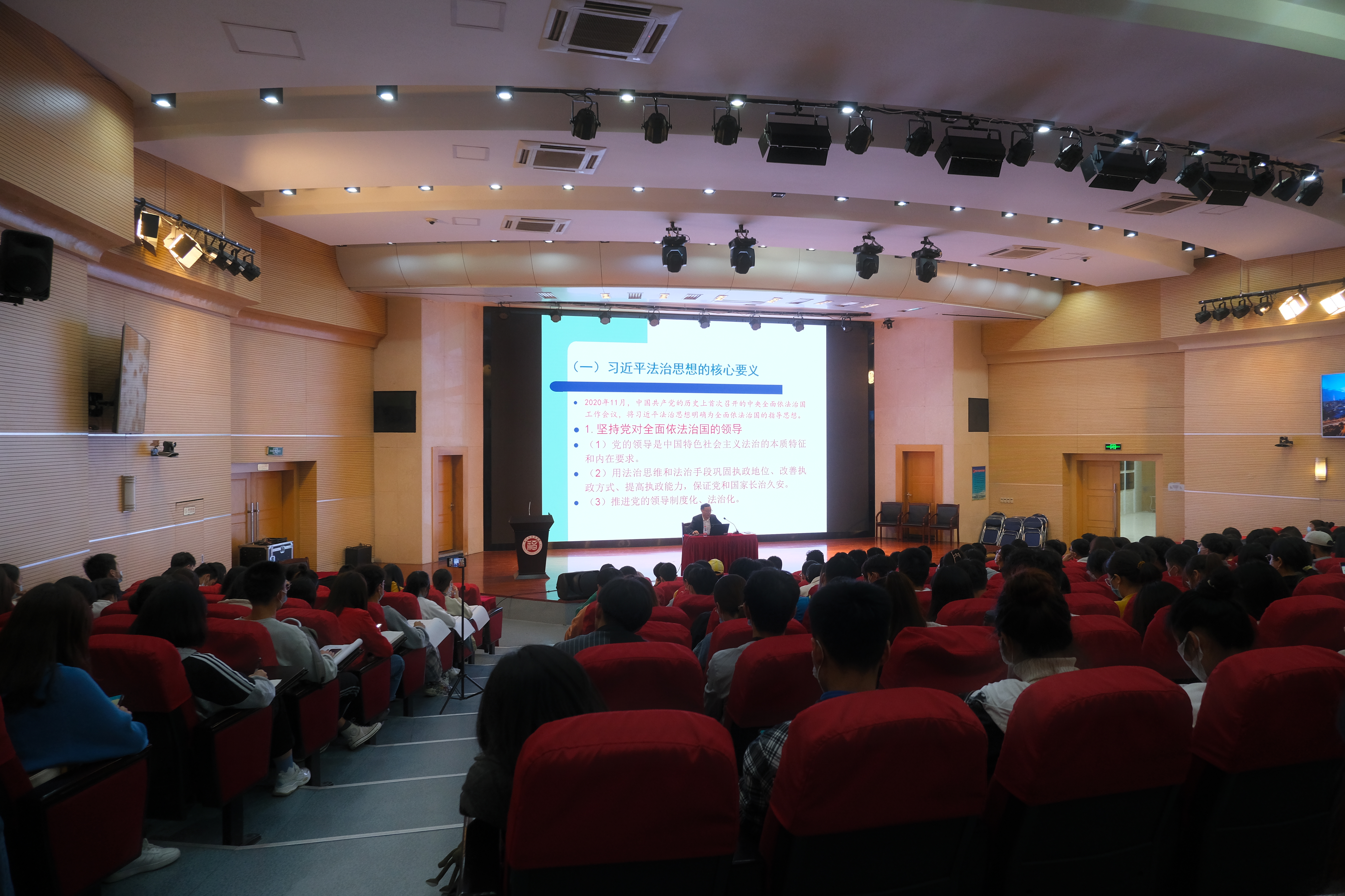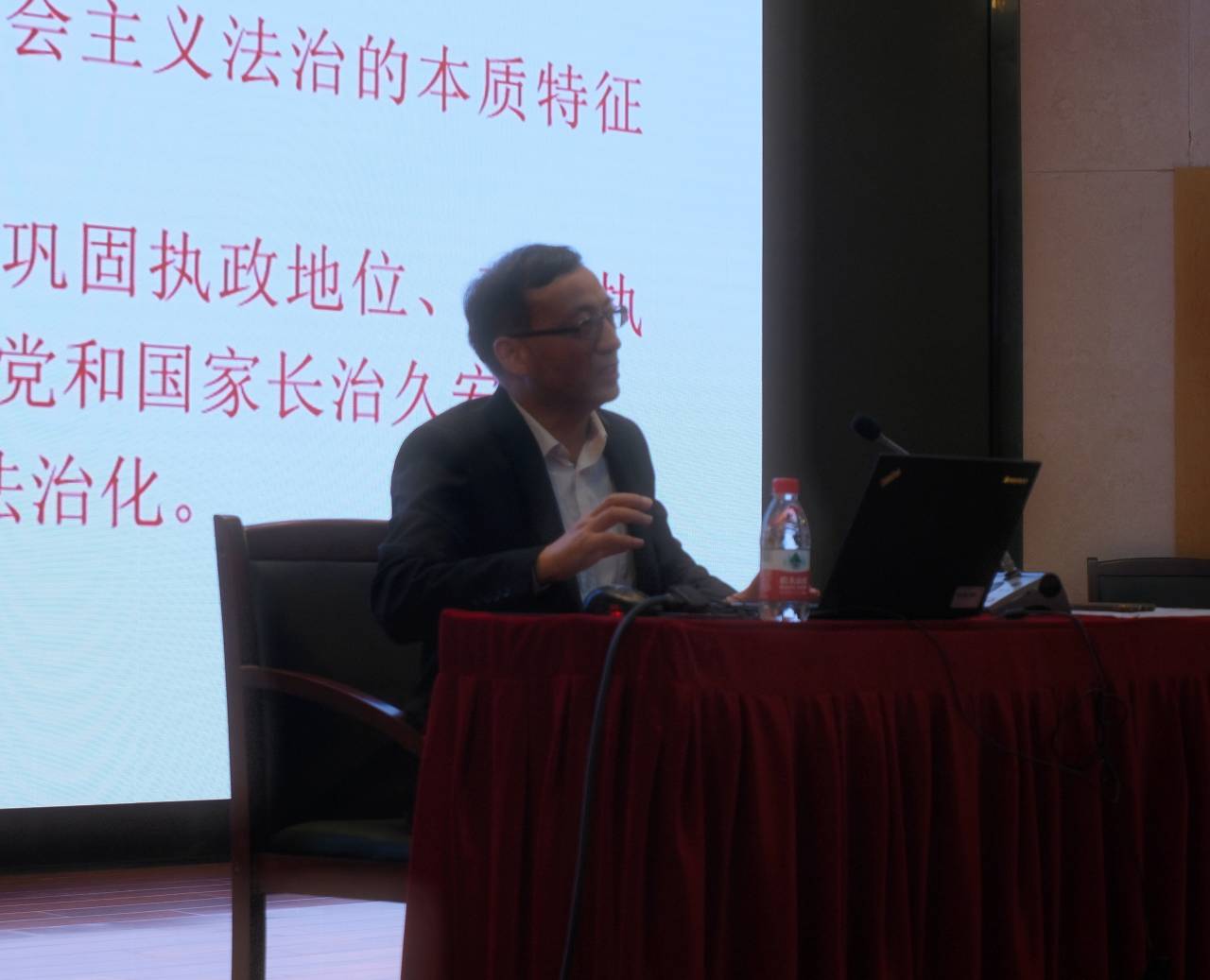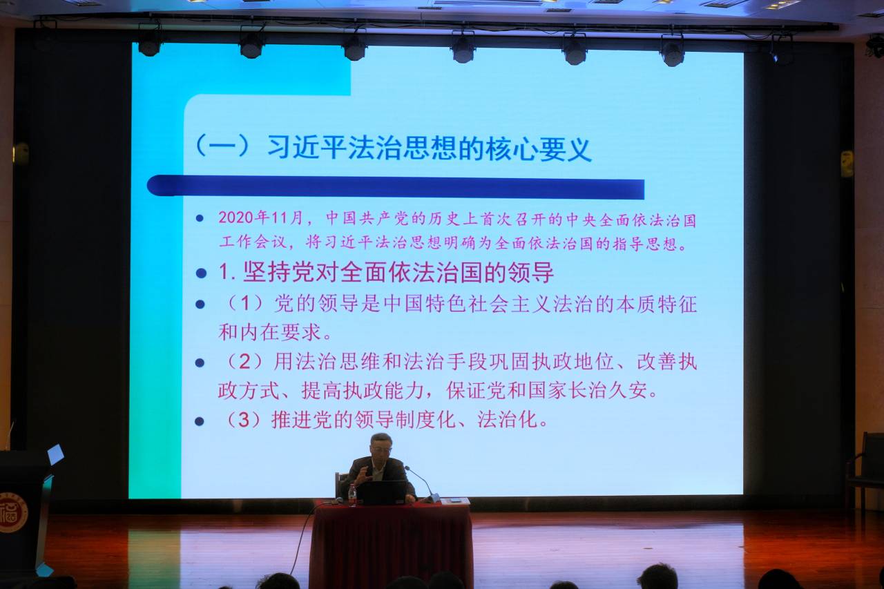在依法治国方面,丁教授向大家详细介绍了习近平法治思想的11个坚持,指出习近平依法治国论述的核心是把党的领导、人民为中心、全面依法治国三者有机统一起来。在讲解过程中,丁教授强调,要把人民的诉求放到核心的位置,系统研究谋划和解决法治领域人民群众反映强烈的突出问题;走中国特色社会主义法治道路,不是割断历史,也不是排斥国外,不能放弃对历史和国外的学习,更不能简单西化、全盘西化,要做到古为今用、西为中用;将管控型的政府改造成服务型的政府,再推动服务型的政府向法治性的政府转变是中国特色社会主义法治建设的重要任务等。