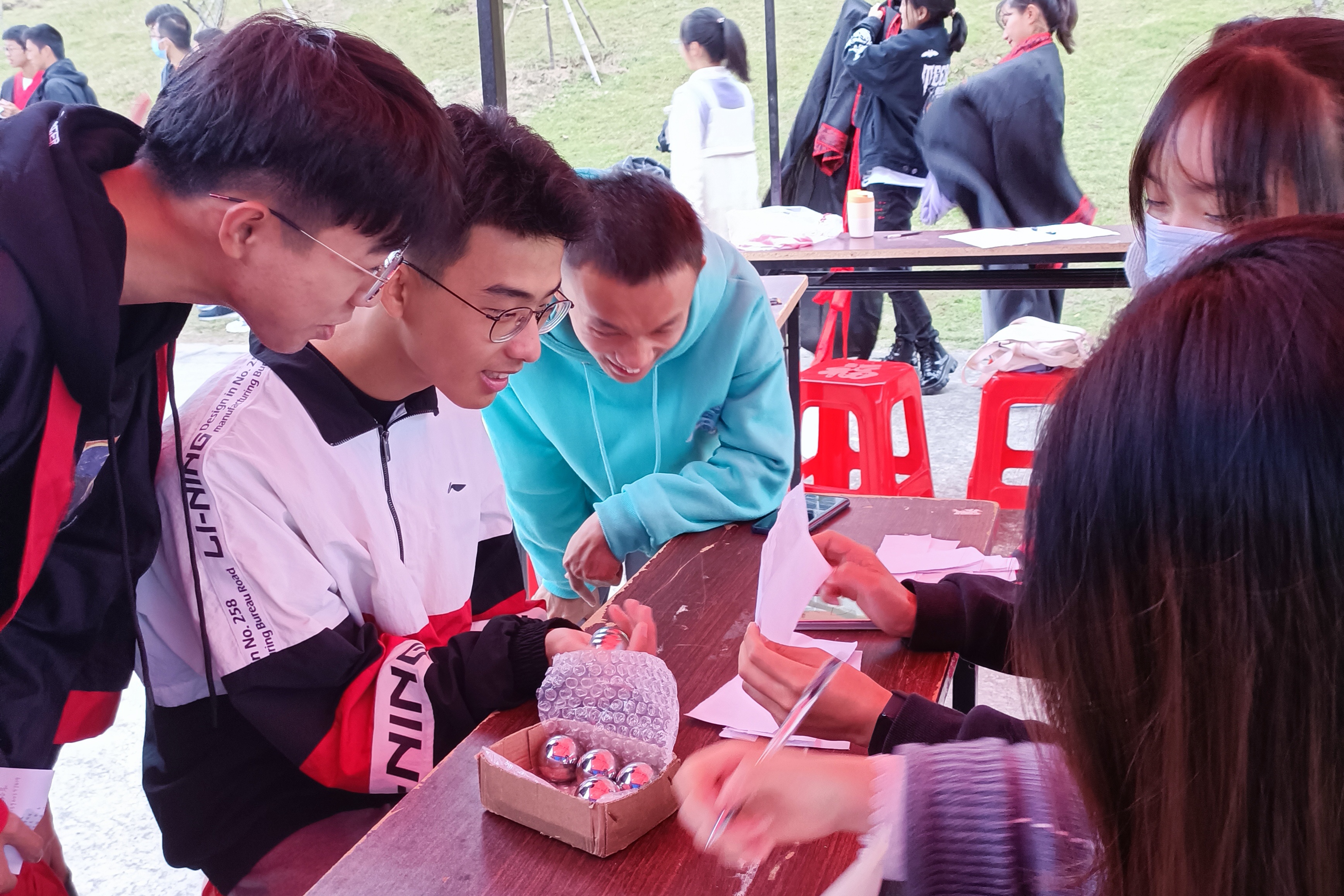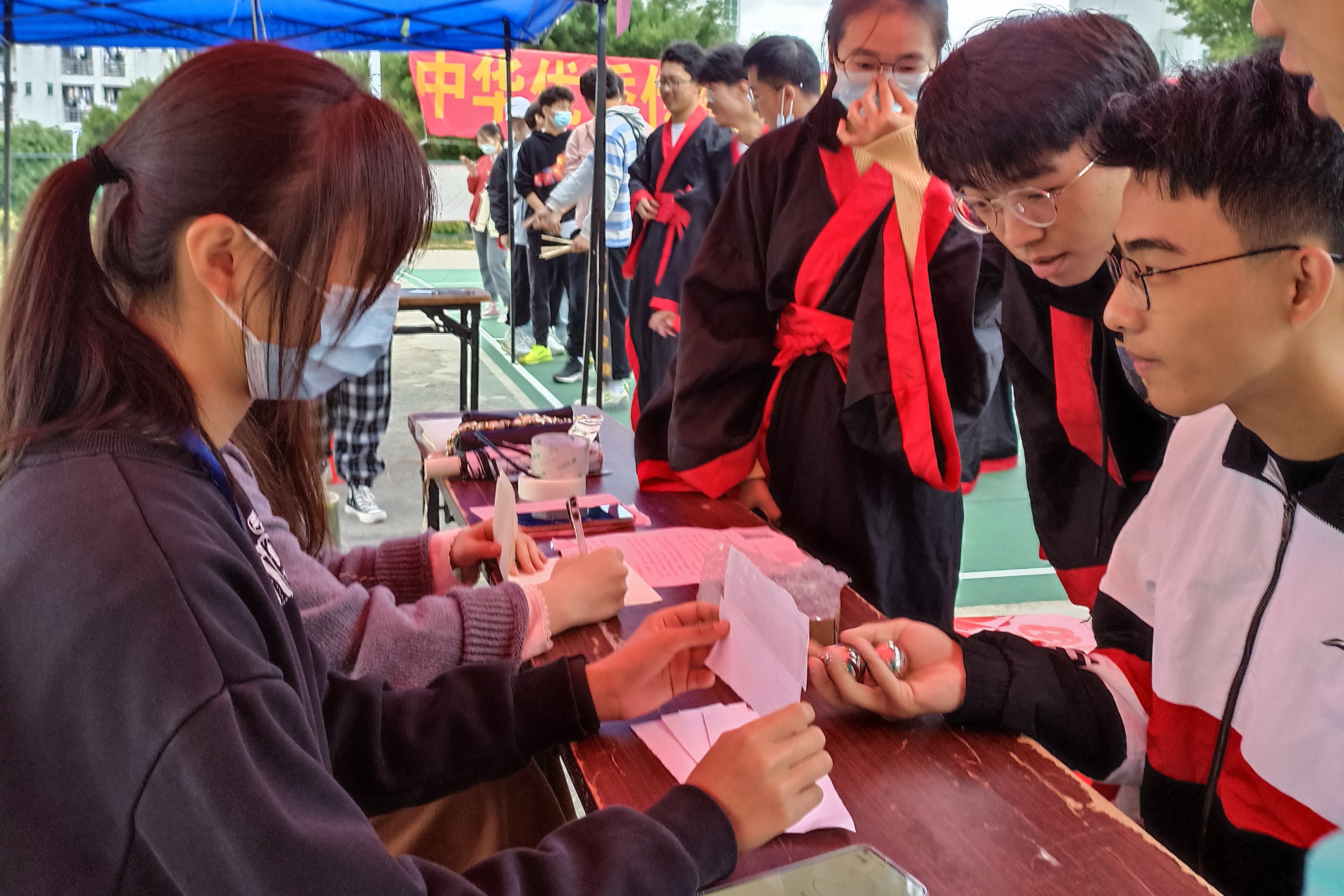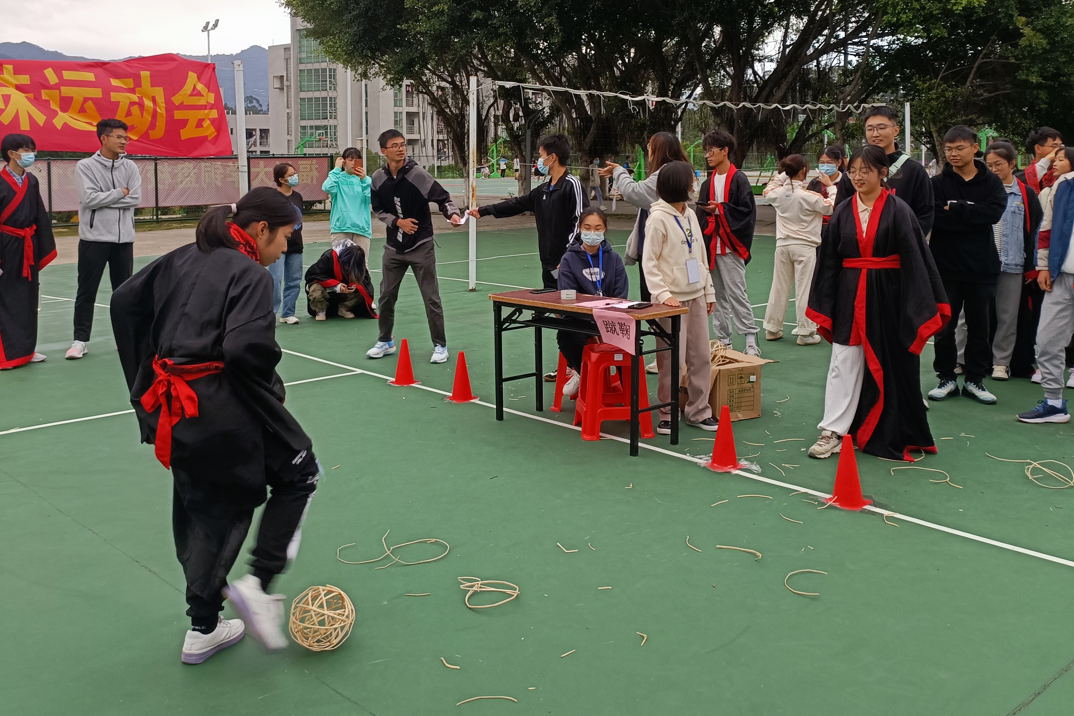 趣味运动会现场分为掌旋球、投壶、木射、蹴鞠四个精彩项目,同学们以组队方式自由参与。活动现场热闹非凡,同学们身着汉服,或手执木矢,小心掷入壶口,重现《醉翁亭记》的“射者中,弈者胜”的热闹场景,让在场的同学感受传统意趣之美;或掌中旋球,巧妙回答传统文化问题,在娱乐中增加传统文化常识;或脚踢蹴鞠,意指风流眼,让竹编的蹴鞠踢出青春意气;木射项目也别出心裁,在立柱上分别写下仁、义、礼、智、信、温、良、恭、俭、让等红色字样,在另外的立柱上写下慢、傲、佞、贪、滥等黑色字样,击倒红柱加分、击倒黑柱减分,让同学们在木射之中深刻体会感受德行之美,自省吾身,立德树人······传统运动项目,不仅让同学们体味古人日常运动的意趣,更让同学们沉浸于传统文化的氛围中,用实际行动发扬优秀传统文化,以青春活力点燃传承的薪火。