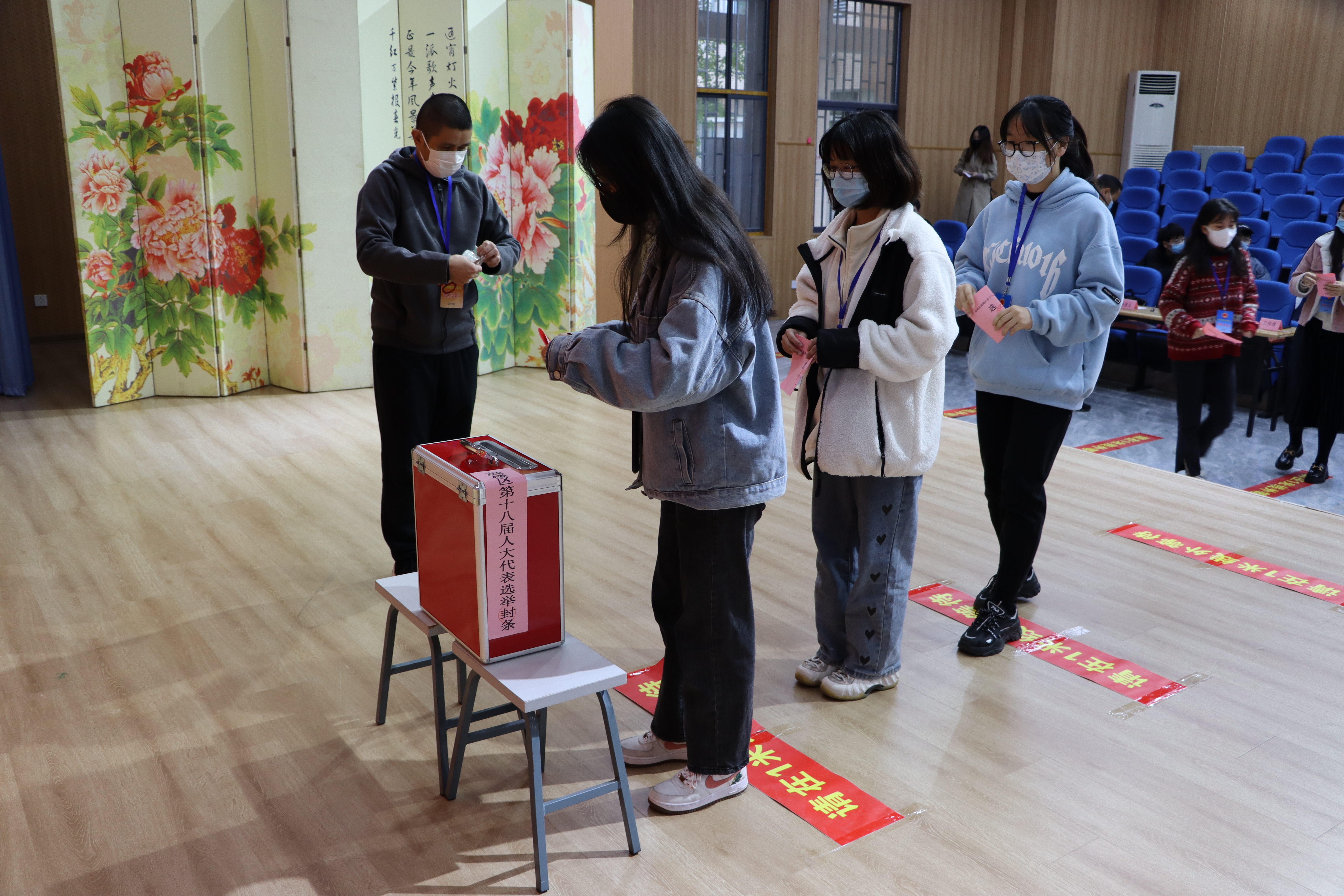 坚持疫情防控不松懈,投票站入口处粘贴好了一米距离线,志愿者分发口罩,并督导前来投票的师生佩戴好口罩、保持距离进入投票站。