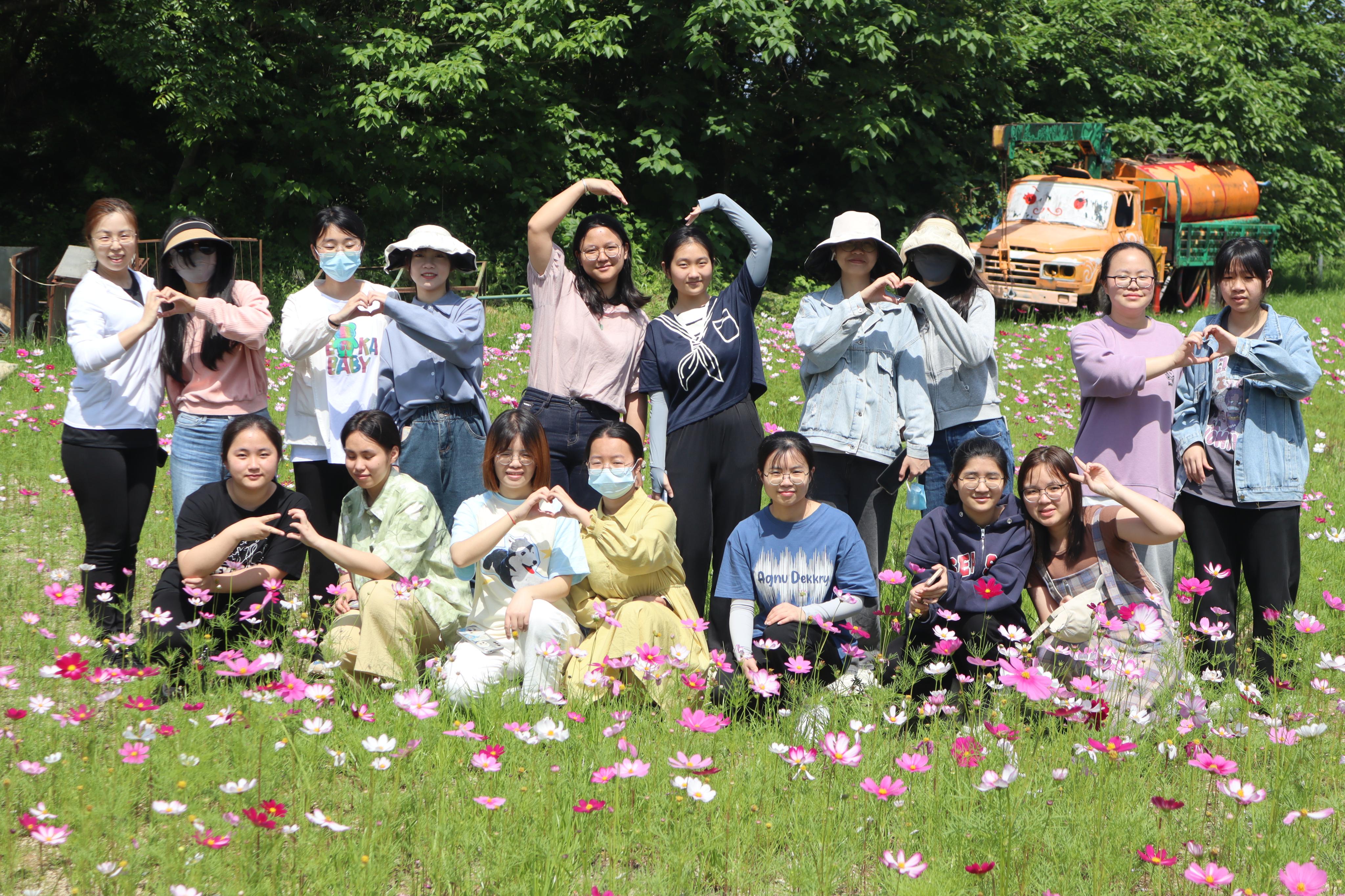 农作结束后,房菁老师与同学们合照。小土坡上铺设了柔软的草皮,沙石地上种植了丛丛红花。草地之上,花海之间,人文师生欢声笑语,共同享受着这片刻闲暇。