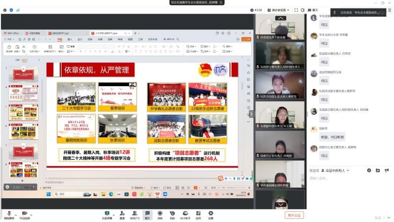 2024届办公室主要负责人奚楚雨详细讲解了场地、物资借用及报账流程。2024届权益部主要负责人许思贤阐明了综测注意事项和其他相关权益问题。