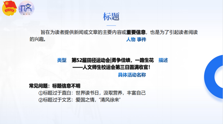 2024届记者团主要负责人陈怡萱以新闻五部分为线索,介绍新闻稿写作常用技巧。2024届视觉传媒部主要负责人曾晨引入“会议三要素”,并详细说明各类摄影的相关要点。2024届网络信息部主要负责人王艺菡阐明推文制作及审核流程,强调排版风格的重要性。通过实例演习,2024届平面媒体部主要负责人陈江钰讲解海报设计的相关原则和PS软件的部分基础操作。