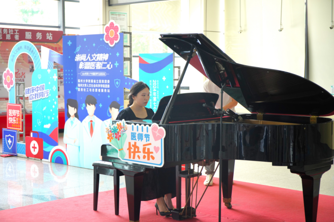 在附属省立医院门诊前的临时舞台上,学子们向医护人员献上精心准备的音乐表演。歌朗诵串烧《落在生命里的光》以小提琴伴奏,分为朗诵与合唱两部分,展现出学子们的青春活力,活跃现场气氛。音乐学系学生王艺霏、林煌海、陈贝妮依次表演钢琴独奏《如愿》《风之甬道》《夜空中最亮的星》。《如愿》曲调优美,《风之甬道》轻柔治愈,《夜空中最亮的星》深情悠扬……精彩表演赢得现场听众阵阵掌声。王淏、庞林雨带来器乐合奏《Always with me》,大提琴与钢琴乐声交织相融,合奏清新自然的唯美乐章。随后,同学们合唱《送你一朵小红花》,并向现场医护人员献上鲜花,表达敬意。演出尾声,现场响起附属省立医院院歌《心中洁白的圣地》,温馨而深情的旋律为本次活动画上圆满句号。