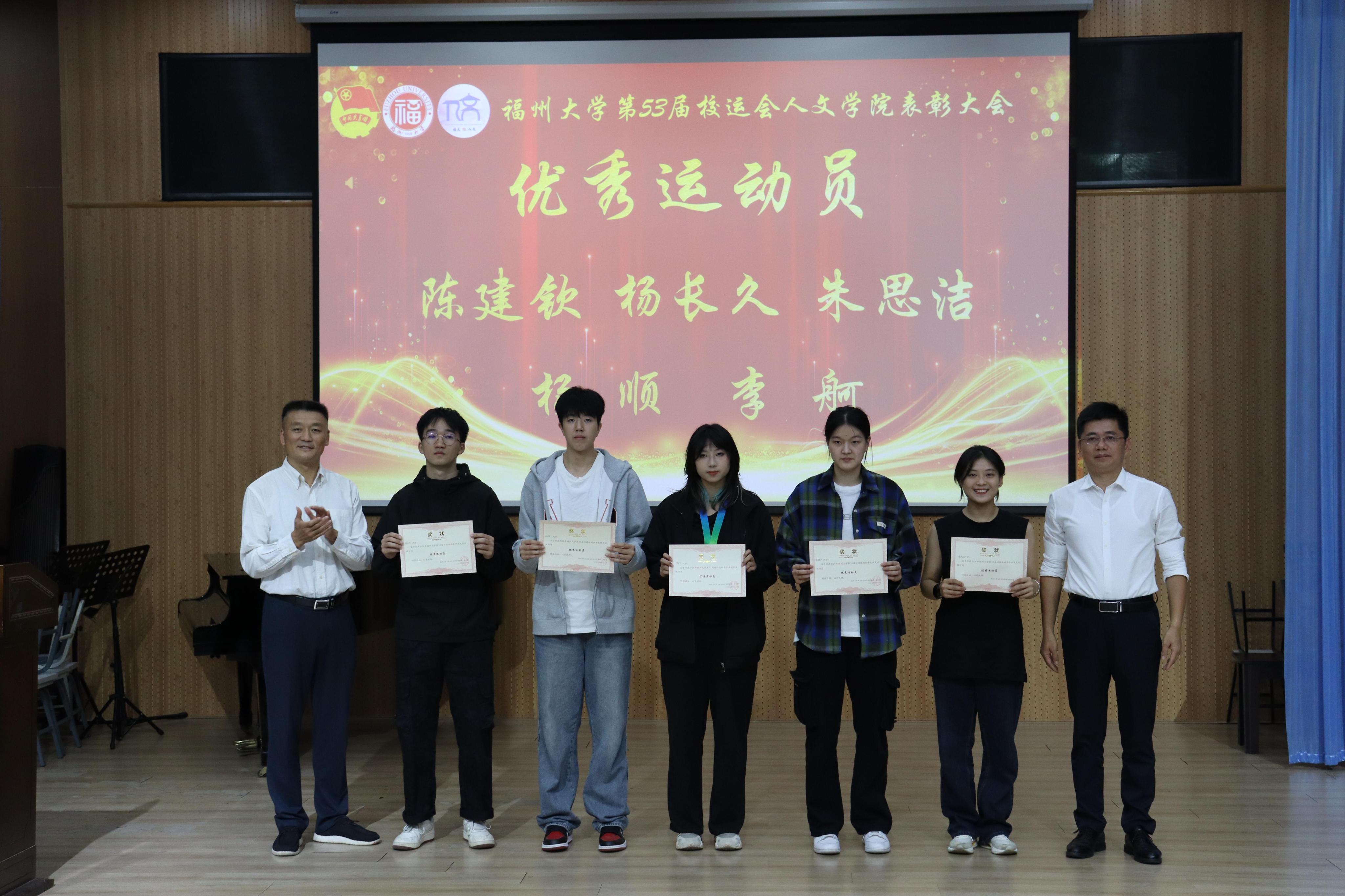 校运会总结表彰大会暨团委、学生会迎新晚会在学院艺术实践基地举行。学院党委书记王群、党委副书记陈永福、团委书记齐朝阳、辅导员丁雅莉、谢婉婷出席活动。会上,王群书记、陈永福副书记为优秀运动员、优秀后勤颁发奖状。
