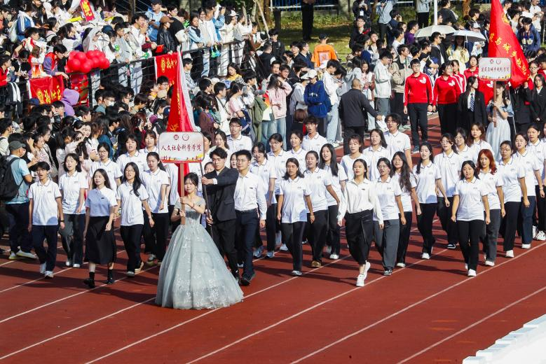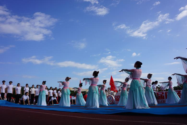 今年是新中国成立75周年,人文学子以舞献礼祖国,演绎中华文化之美;以激昂姿态拼搏前行,谱写人文璀璨新篇。入场方阵,精神饱满,步伐矫健,列队整齐,舞动青春绚烂风采,一展青年自信活力;古扇灵动,衣袂翩跹,舞姿轻盈,合柔美刚健于一体,彰传统文化之精魄。更有蓝色条带穿插队列,如河如海,为表演赋予澄澈底色。