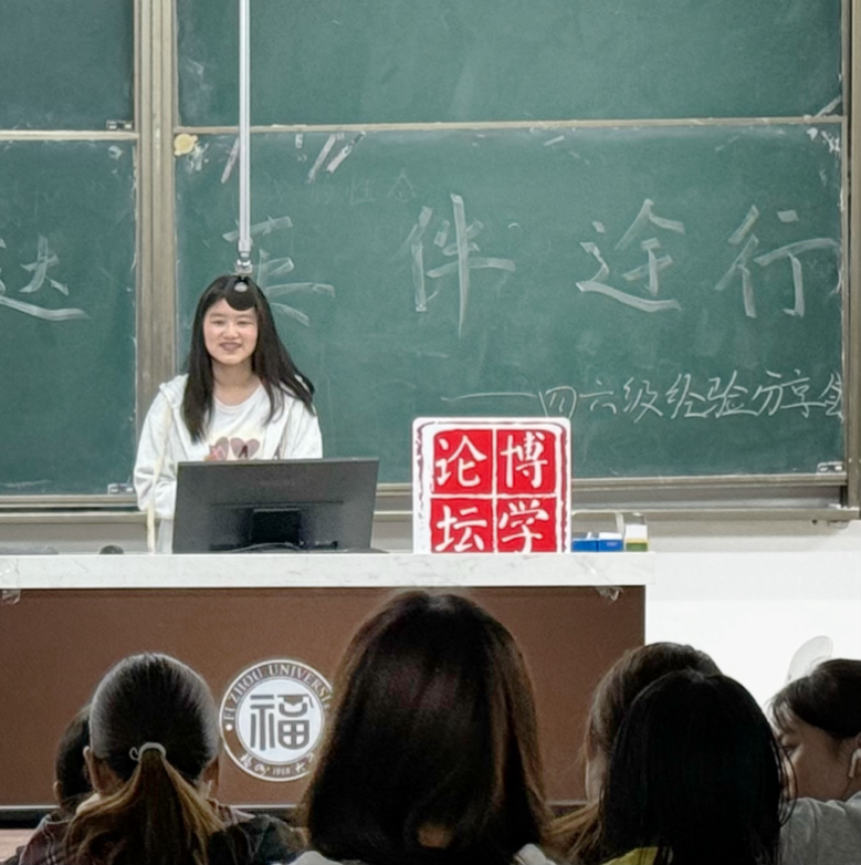 2023级应用心理学专业的严婉蓉同学介绍四、六级考试的流程及要求。她从写作与听力训练、选词填空与阅读理解、翻译与词汇积累、模拟考试与心态调整四个方面介绍每个部分的题型、分值及应对技巧,并推荐了相关书籍和学习软件。