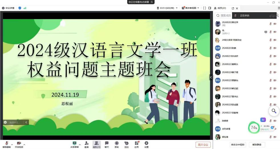 11月18日、19日,2024级权益委员在各班开展了权益班会。会上,权益委员们对学院权益工作体系进行简单介绍,向同学们说明了维护权益、反馈问题的渠道,帮助同学们增强维护自身权益的意识。权益委员们还将各餐厅经理和饮食管理科联系方式提供给同学们,并讲解了反馈问题的基本格式,有利于日后草莓视频