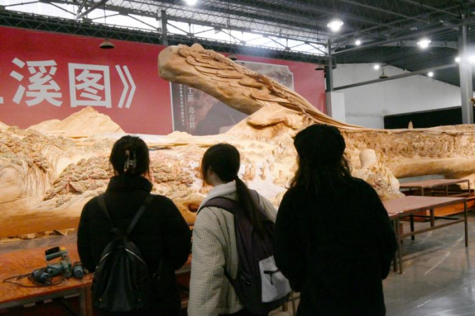 下午,实践队来到莆田美术馆,在讲解员的带领下参观由中国工艺美术大师郑春辉及其团队创作的长达120米的大型木雕作品《京杭大运河》。作品于2023年初开工,分为北方卷、中卷和江南卷三部分,至今已基本完成粗坯制作,迈入细化创作阶段。