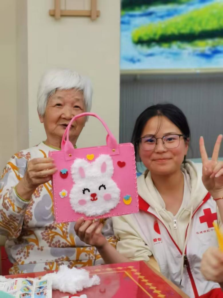一个个可爱的刺绣包包承载着青年志愿者与爷爷奶奶们的浓浓温情,志愿者们与老人共同回忆童年的乐趣,分享创作的成就感,在一针一线中链接起情感桥梁。