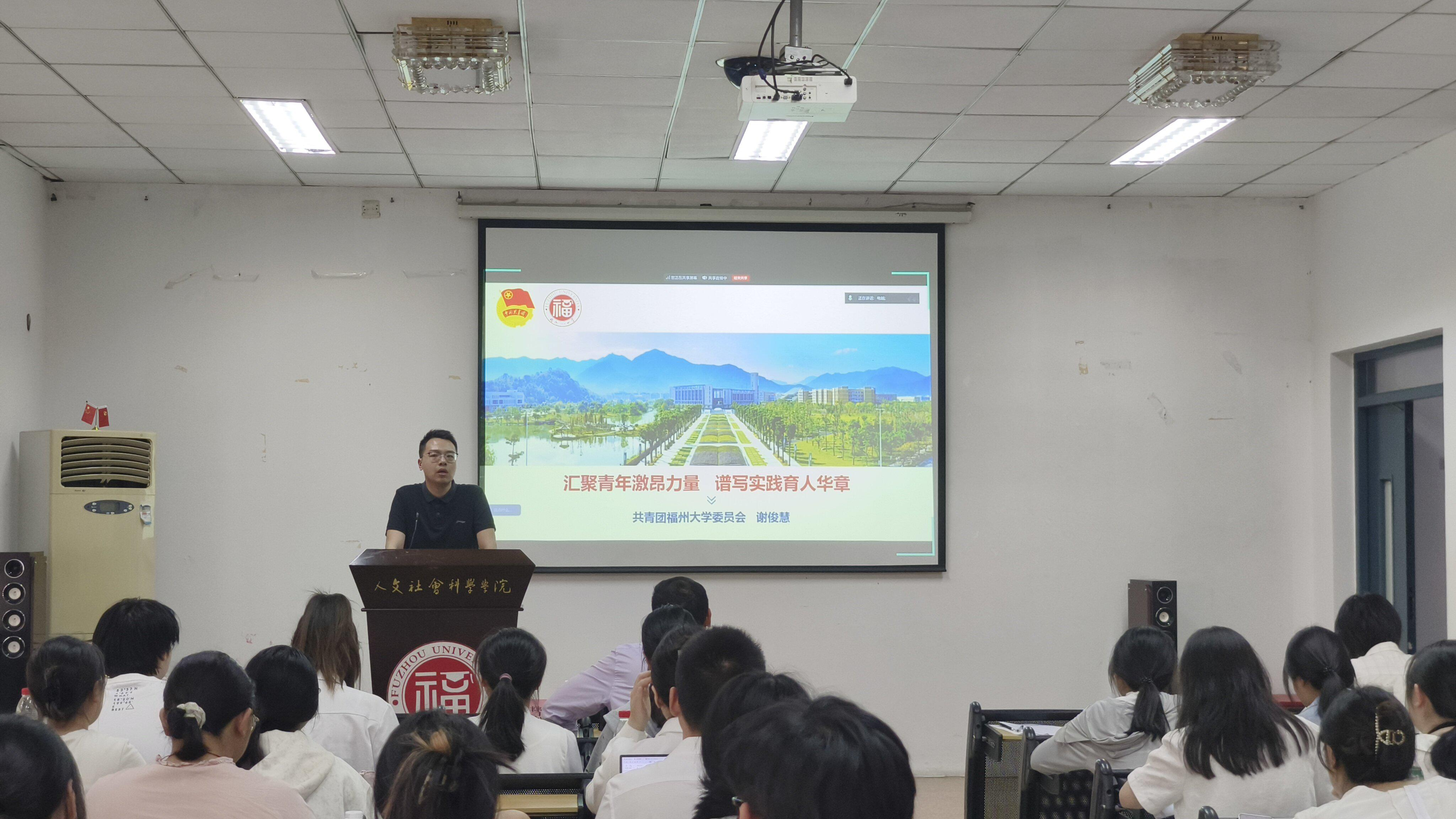 学生团委副书记陈永斌说明社会实践相关内容。他指出社会实践的定义和类别,重点讲授“三下乡”“扬帆计划”的了解渠道,对学院的几支实践队作讲解,并分享自身的实践经历。