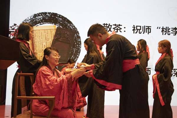 毕业典礼的一大特色。身着汉服的毕业学子齐至孔夫子画像前圣拜,并向老师敬茶,一敬茶,祝师“桃李满天下”,二敬茶,谢师“恩深情义重”,谢师敬茶展现了人文学子对老师们的浓浓情意。随后吴慧娟副院长为同学们道明毕业之训,告诫同学们在未来的生活中时刻不忘“为社会福,为邦家光”。