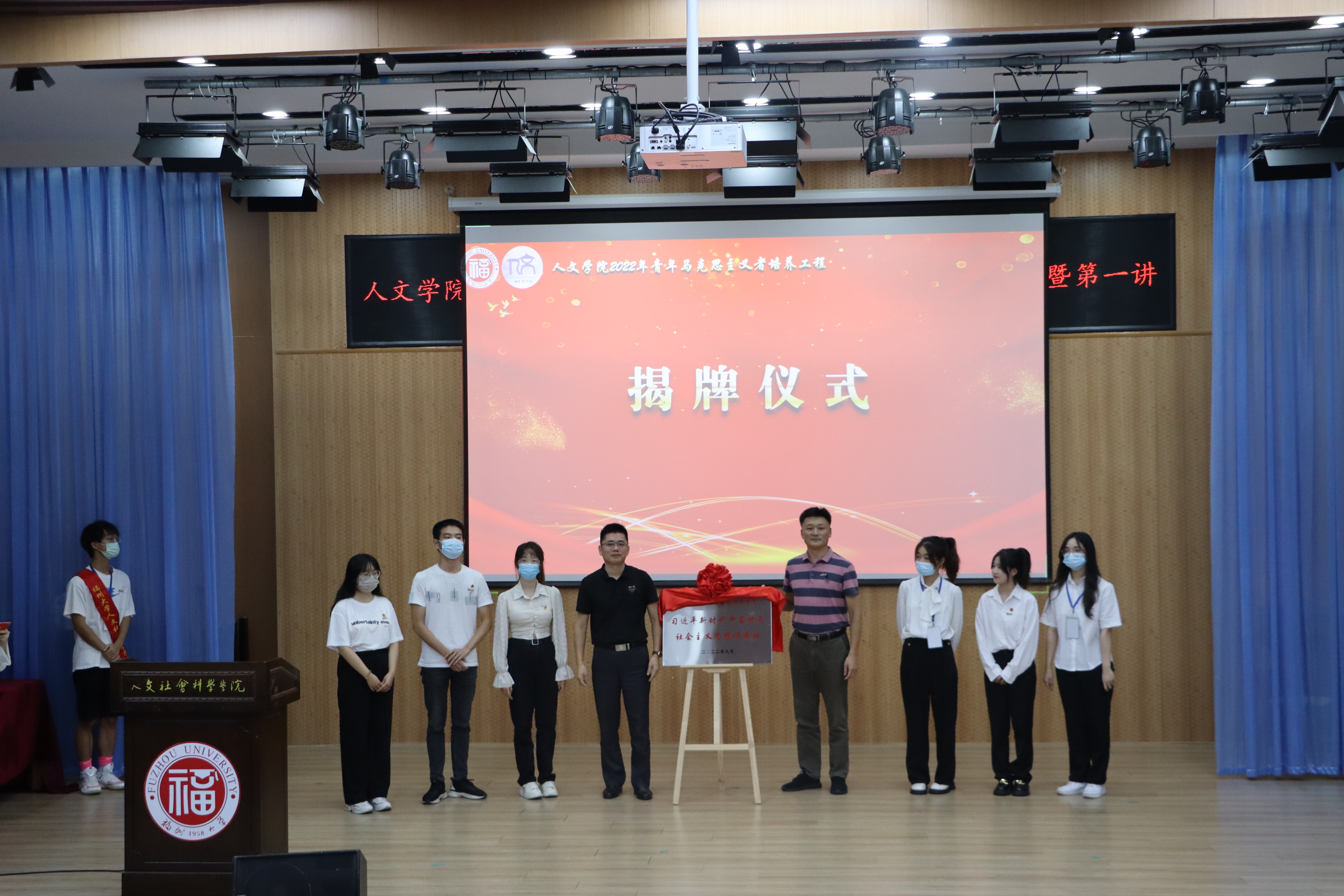大学生骨干培训班授旗,并与院党委陈永福副书记一同为“习近平新时代中国特色社会主义思想读书社”揭牌赠书,以此鼓励同学们更全面地学习马克思主义理论与习近平新时代中国特色社会主义思想。