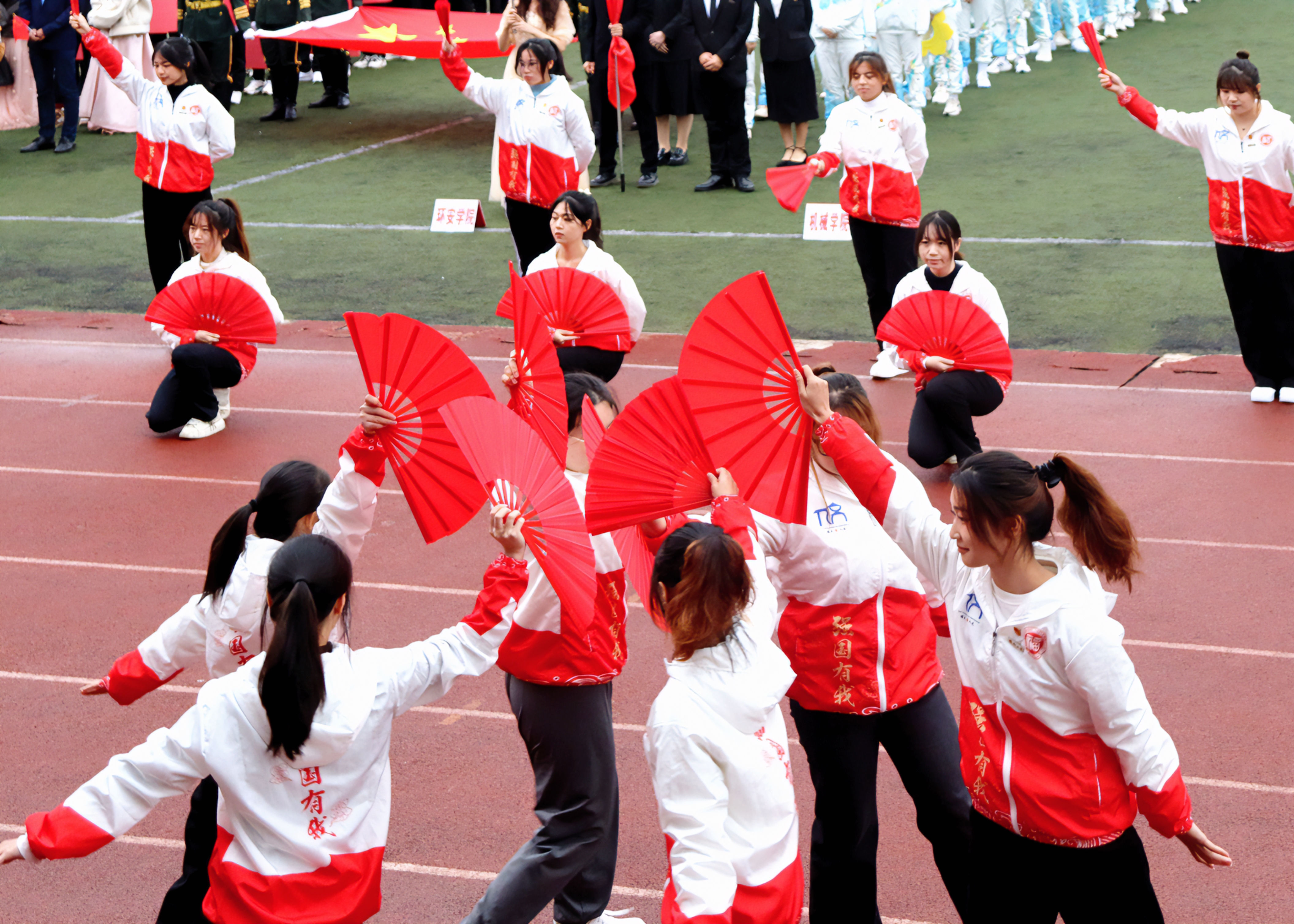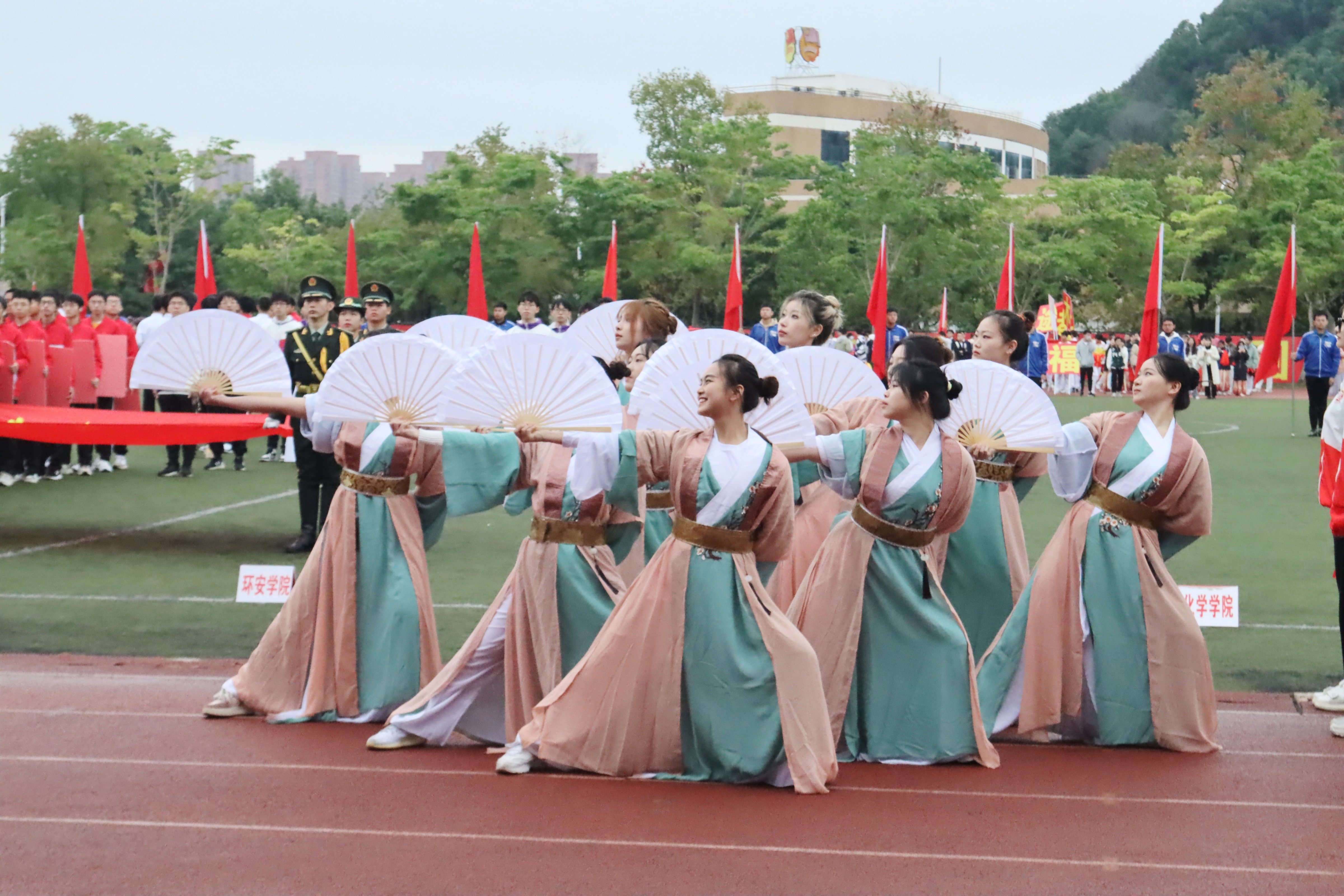 舞龙队、舞狮队为校运会带来开场表演。音乐激昂,动作流畅,四龙四狮在操场上游走奔腾,传统艺术形式释放着青春活力。国旗护卫队迎风而动,迈步铿锵,尽显军人风采。