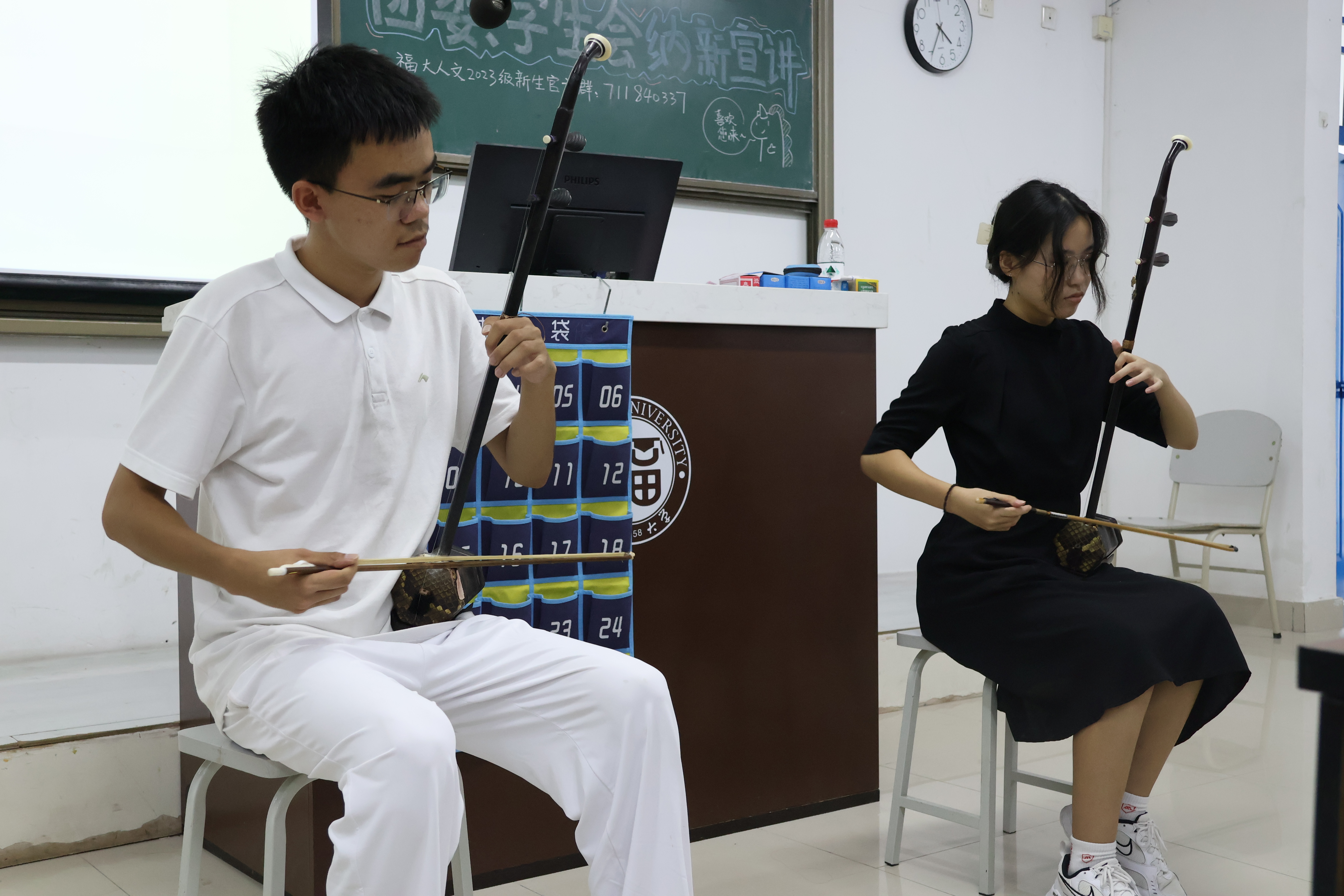 除了纳新宣讲之外,本次活动还精心安排了抽奖与问答环节,丰富的礼品被送至每一位幸运新生手中。更受好评的是由文化部带来的二胡合奏《兰亭序》,柔美乐音如流水潺潺,婉转悠扬,余音绕梁。