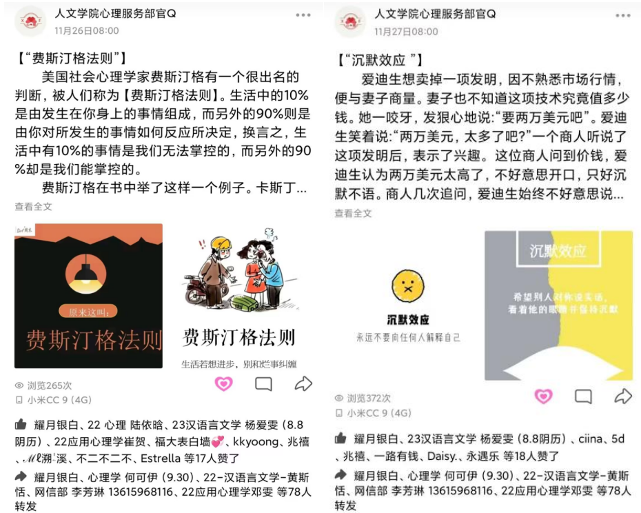 本次打卡活动通过QQ空间分享、微信朋友圈分享传播心理知识。在心理服务部官Q发布心理科普知识后,参与活动的同学们转发至QQ空间或微信朋友圈,分享自身感悟和生活体验。心理服务部官Q共发布七条心理知识,参与人数共计117人,转发次数达593次。