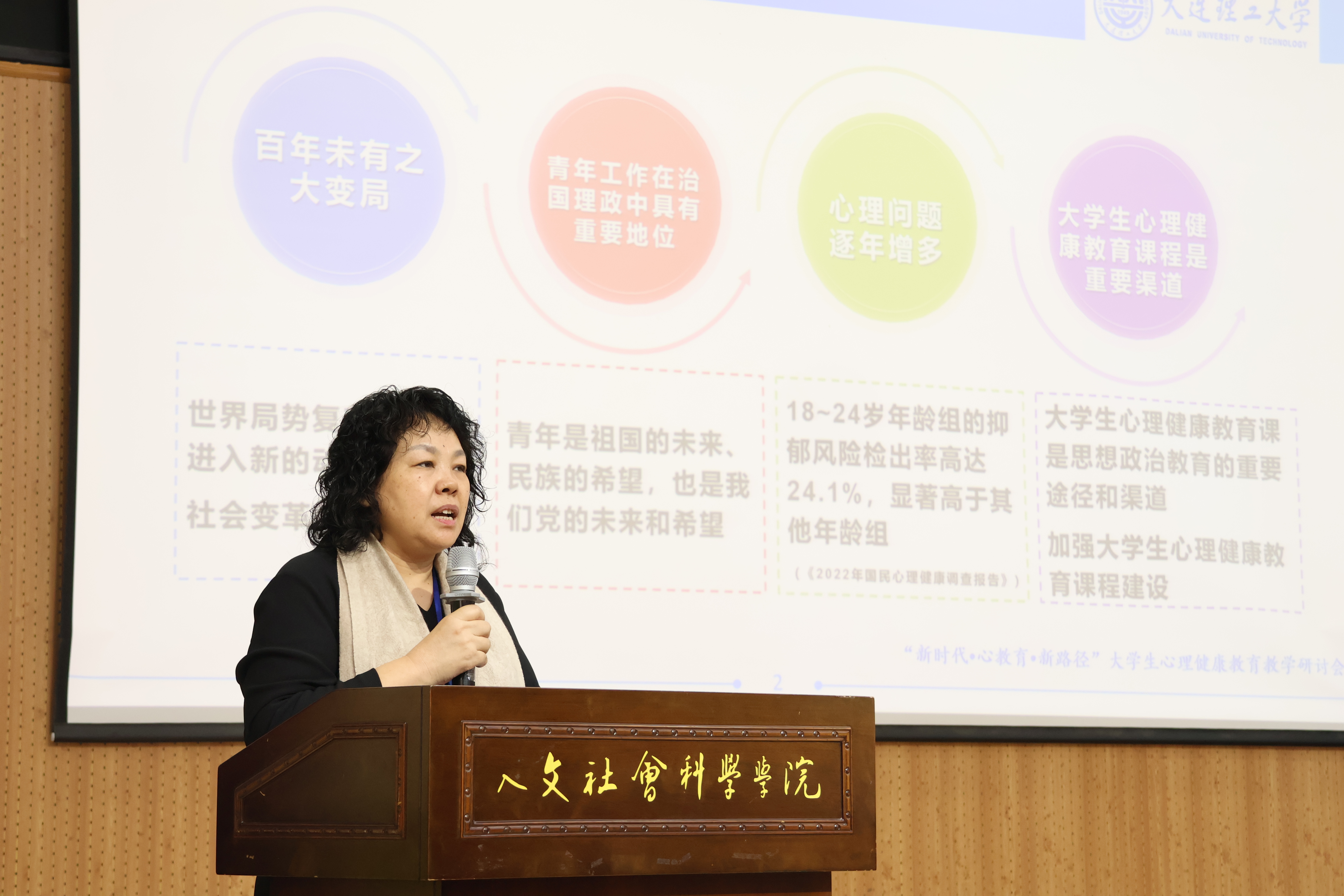 在专家报告环节,大连理工大学胡月教授和西南交通大学宁维卫教授分别以《新时代高校心理健康教育课程教学改革探索与实践》和《大学生心理健康课程建设的思考与实践》为主题作主旨报告。胡月教授从课程相关信息、教学课堂管理、教学方法、教学过程、教学反馈和反思、教学方法创新等几个方面进行报告,启示高校要将新时代的大学生心理健康教育课程与中国优秀的传统文化相结合。