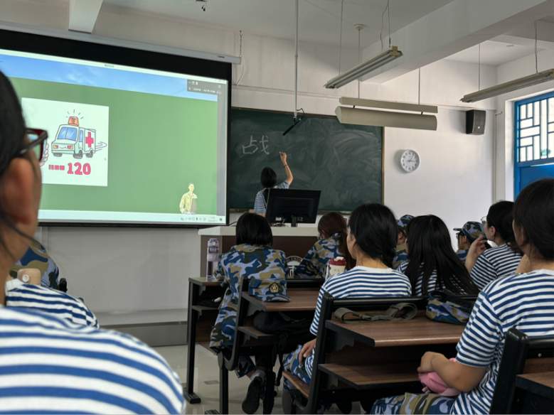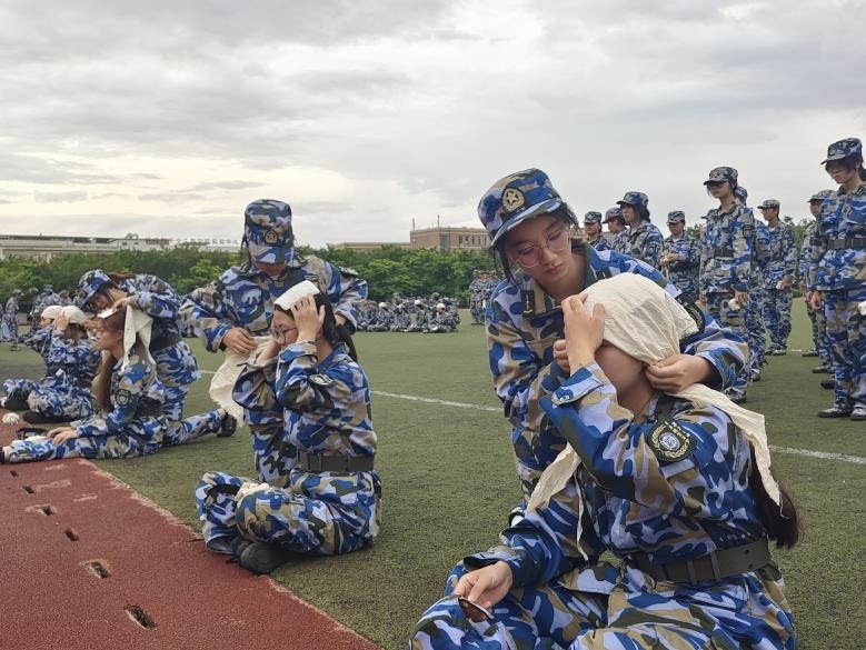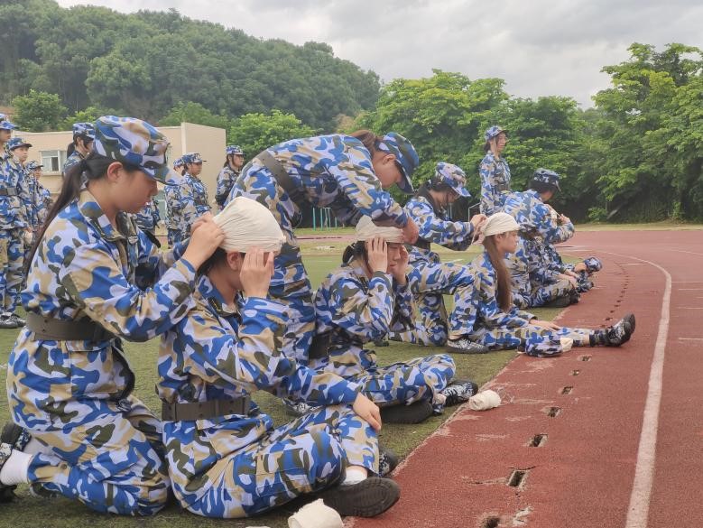 军训期间,各连队组织军事技能讲座,帮助同学们学习急救包扎技能。教官们详细讲解各种伤口的处理方法和包扎技巧,并拿起手中道具进行模拟训练。最后,教官挑选了几名同学上台作示范练习。
