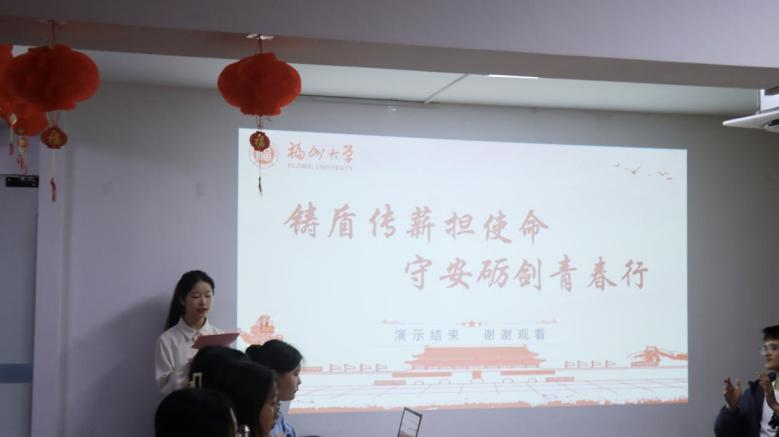 2024级汉语言文学1班于铜盘校区“一站式”学生社区服务中心开展“铸盾传薪担使命,守安砺剑青春行”主题班会。学院党委副书记赵燕松、鼓楼区反诈中心警官庄丽钦、2024级汉语言文学专业班主任郭玉婵、2024级辅导员谢婉婷参加班会。
