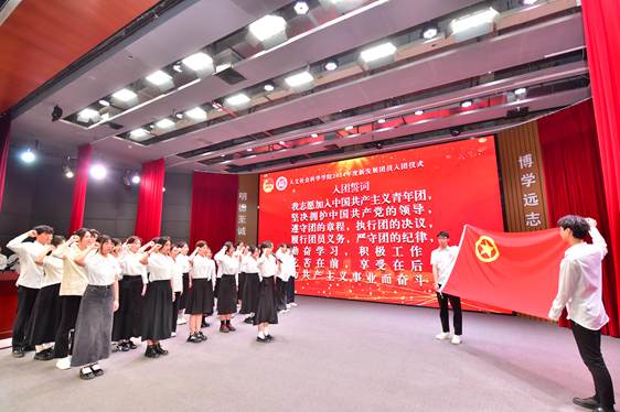 大会最后举行新团员入团仪式。院团委书记齐朝阳宣读2024年度新发展团员名单并主持仪式。学院领导老师为新团员佩戴团徽后,新老团员共同宣誓。